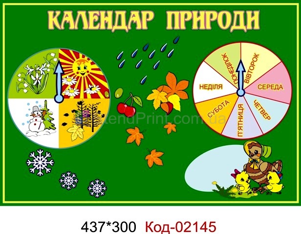 Куточок природи оснащений стрілочками які обертаються навколо своєї осі, за допомогою цього куточка природи діти навчаться розпізнавати погоду, пори року і дні тижня. Поверхня стенду стійка до миючих засобів, зображення не стирається і залишається незмінним протягом усього терміну експлуатації. Стенд укомплектований шурупами для кріплення на стіну.